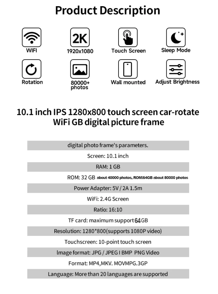 7.wifi digital picture frame is 10.1 inch HD 800*1280 IPS full viewing angle, with touch and automatic rotation function, Support FHD 1920*1080P photos and (30FPS) short videos.